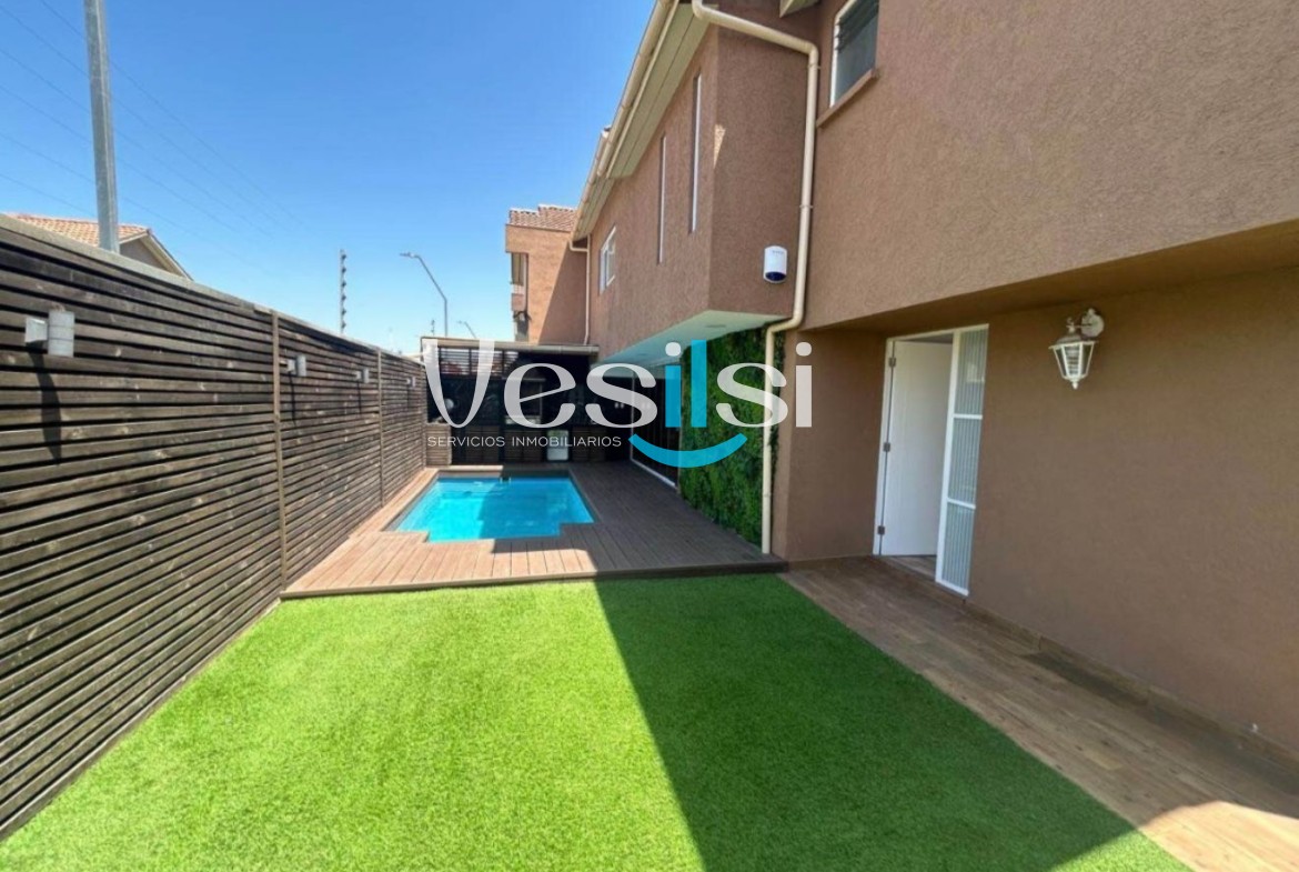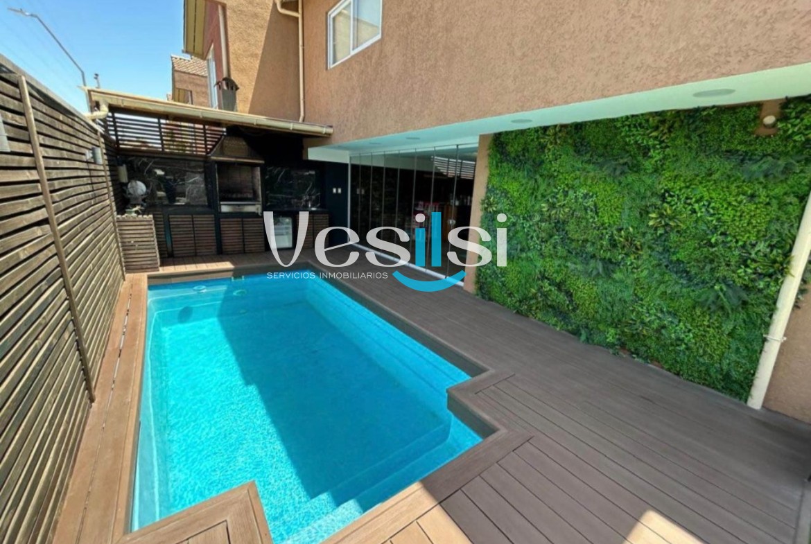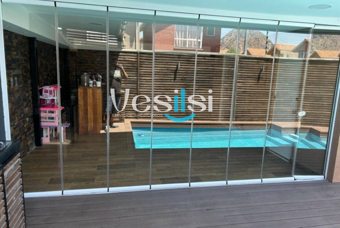 Esta casa se encuentra ubicada en la Comuna de San Bernardo, esta distribuido de la siguiente manera, cuatro habitaciónes matrimoniales, dos baños completo en suits, dos baños completo en pasillo, una cocina independiente americana, cocina electrica, terraza con cierre panoramico mas bar-lounge, piscina y ESTACIONAMIENTO Y BODEGA INCLUIDO.